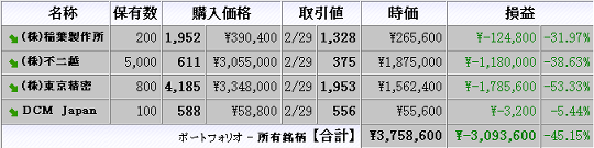 年明けから日経平均が暴落する日が続いたが、所有株は、その日経平均の数倍の下落率で暴落し続けた('A`)