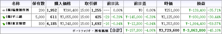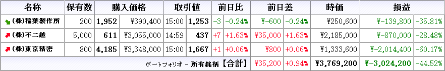株は本日売買無し、所有株は不二越と東京精密が下落、稲葉製作所は変わらず(クリックで拡大)