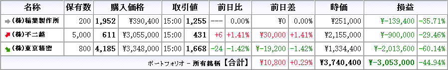 不二越の上昇で一応トータルではプラスだが、東京精密は相変わらず下落が止まらない('A`)