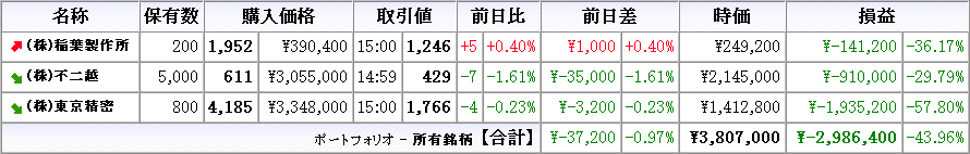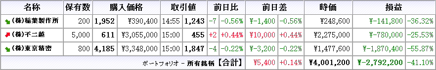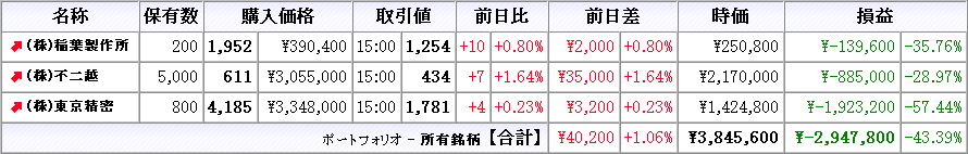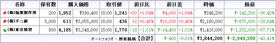株は本日売買無し、所有株は稲葉製作所が上昇、他は下落(クリックで拡大)