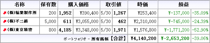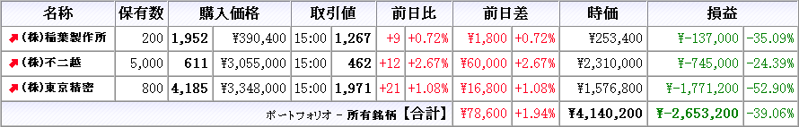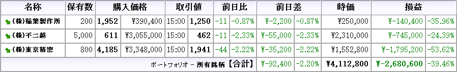 株は本日売買無し、所有株は全て下落(クリックで拡大)