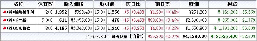 株は本日売買無し、所有株は稲葉製作所が下落、他は上昇(クリックで拡大)