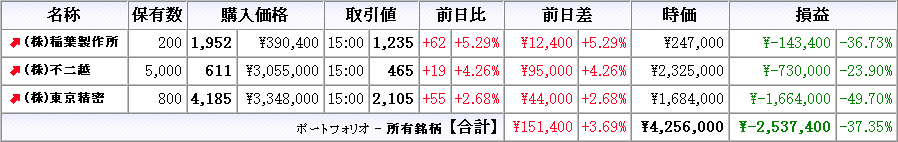 株は本日売買無し、所有株は東京精密が下落、他は上昇(クリックで拡大)