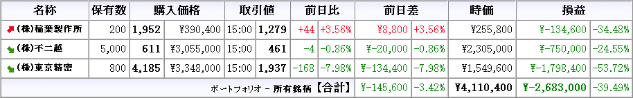 株は本日売買無し、所有株は稲葉製作所が上昇、他は下落(クリックで拡大)