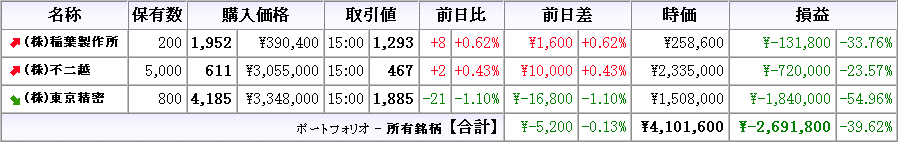 株は本日売買無し、所有株は東京精密が上昇、他は下落(クリックで拡大)