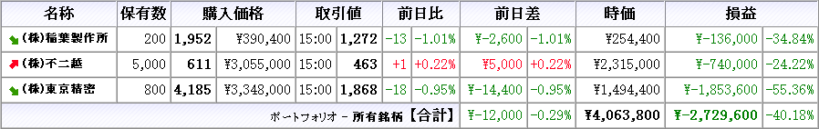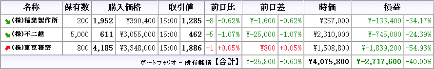 株は本日売買無し、所有株は不二越が上昇、他は下落(クリックで拡大)