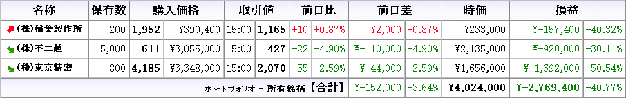 株は本日売買無し、所有株は稲葉製作所が小幅上昇 、他は下落(クリックで拡大)