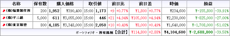 株は本日売買無し、所有株は全て下落(クリックで拡大)