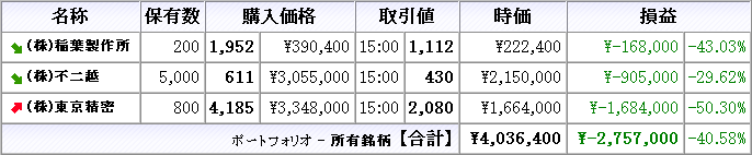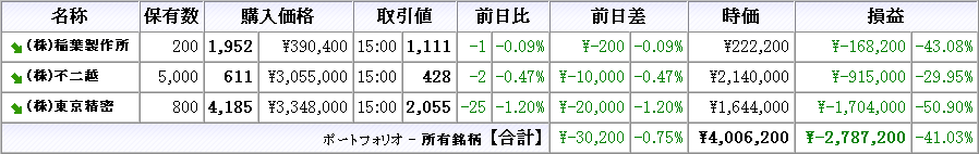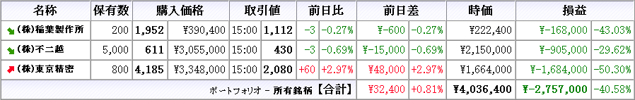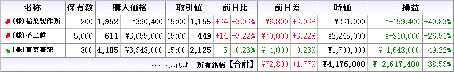 株は本日売買無し、所有株は東京精密が下落、他は上昇(クリックで拡大)